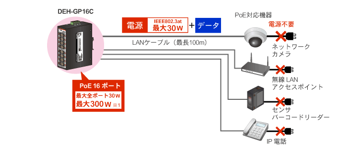 ●IEEE802.3af/at規格準拠 : 大容量のPoE対応機器に給電可能