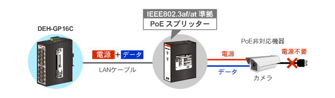 PoEに対応していない機器の場合は、PoEスプリッターを使用すると、LANケーブル1本でもデータ通信と電力供給を可能にします。